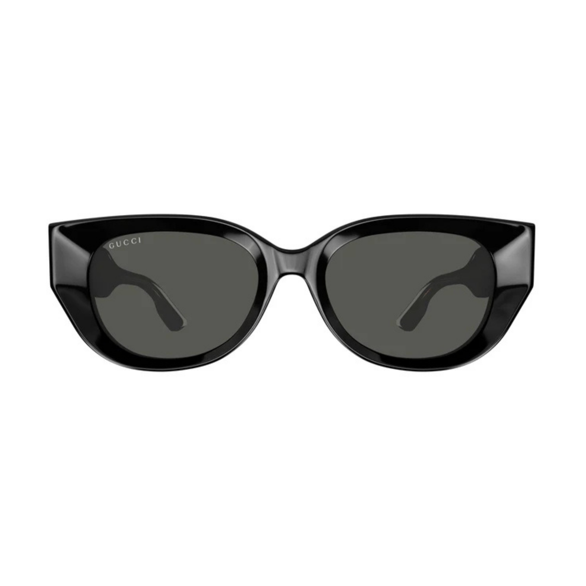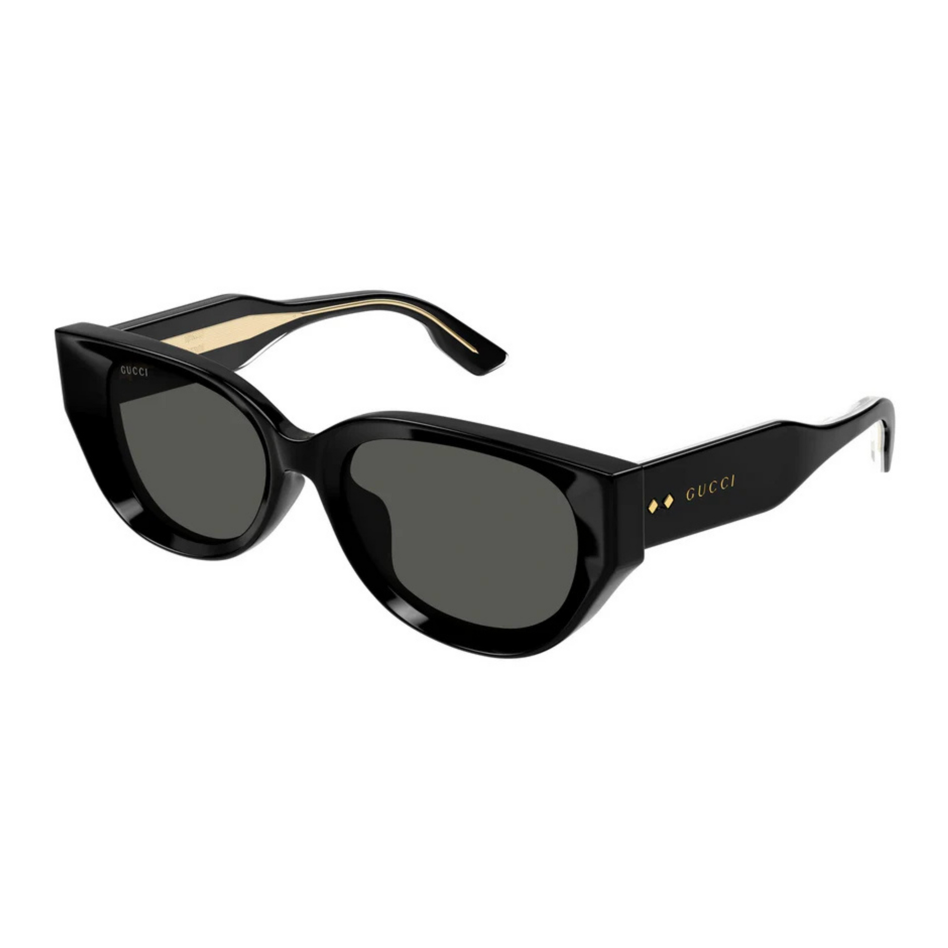 Con una forma cat eye redondeada y una presencia contundente, estas gafas están embellecidas con remaches icónicos de Gucci y el logo dorado grabado en las patillas, aportando un detalle distintivo y elegante.